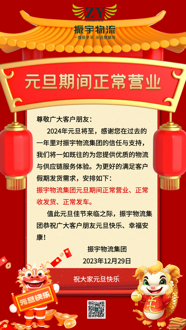 2024年元旦将至,感謝您在過去的一年裏對(duì)振宇物流集團的信任與支持,我們将一如既往的爲您提供優質的物流與供應鏈服務體驗。爲更好的滿足客戶假期發(fā)貨需求,安排如下: