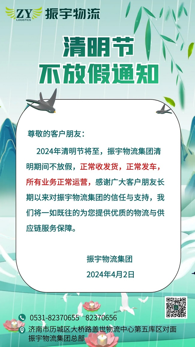 2024年清明節将至,振宇物流集團清明期間不放假,正常收發貨,正常發車,所有業務正常運營,感謝廣大客戶朋友長期以來對振宇物流集團的信任與支持,我們将一如既往的爲您提供優質的物流與供應鏈服務保障 。