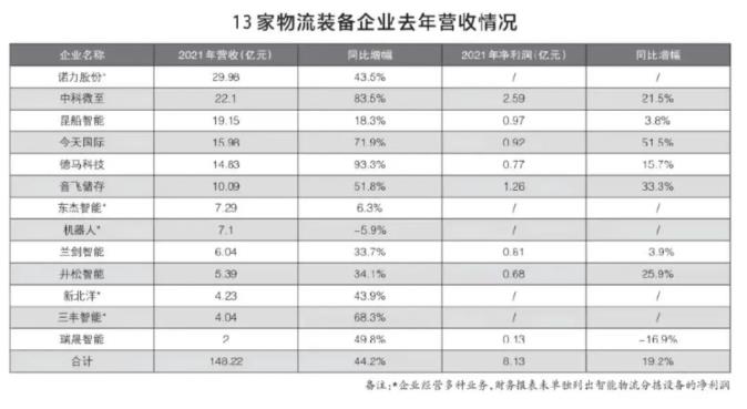 截至4月30日,A股主要上市企業均發布年報(bào),其中包括以智能物流分揀系統爲主要業務的11家企業,加之即将IPO的2家企業披露全年業績,13家企業2021年營收合計爲148.1億元,2020年爲102.8億元,增長(zhǎng)44.2%(見圖表)。
