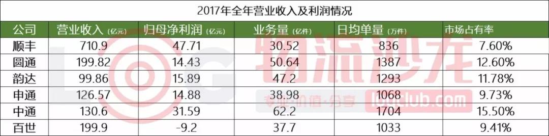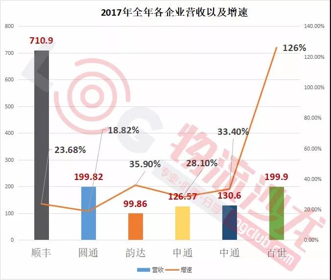 我們可以從營收增速來看看各家企業表現力。具體來看,百世第一,增幅高達126%,其次是韻達、中通、申通,分别是35.9%、33.4%、28.1%,都高於(yú)郵政局公布的2017年全年快遞收入增長(zhǎng)速度(2017年行業增速爲24.7%)。