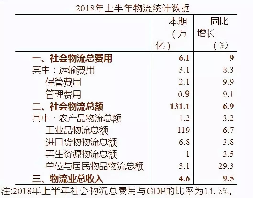 2018年1-6月,社會物流總費用爲6.1萬億元,同比增長(zhǎng)9%,增速比一季度提高2個百分點;物流市場(chǎng)規模穩步增長(zhǎng),物流業總收入爲4.6萬億元,同比增長(zhǎng)9.5%,增速比一季度提高1.3個百分點。